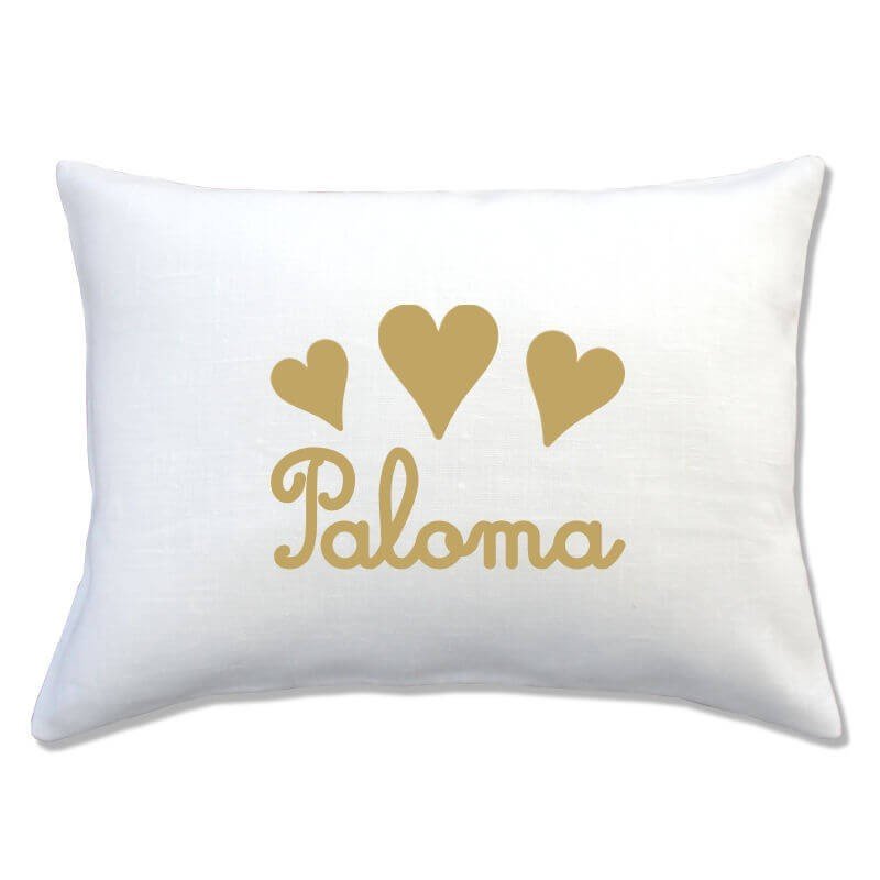 Coussin en lin blanc personnalisé avec un prénom, motif coeurs