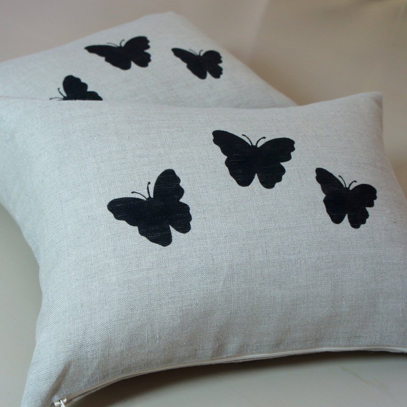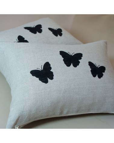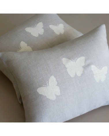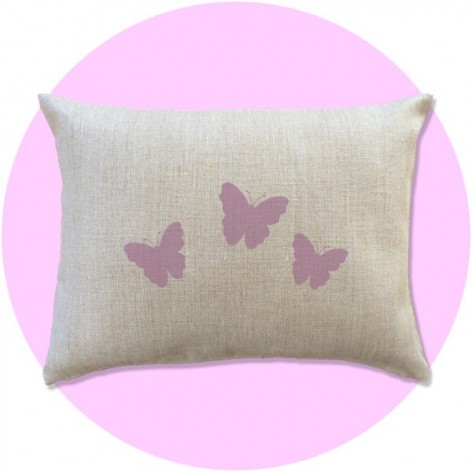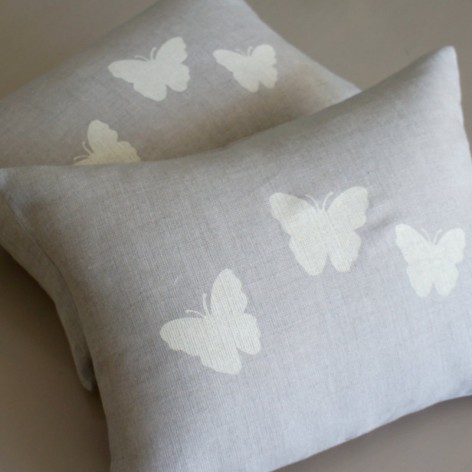 Coussin en lin avec des papillons peints au pochoir, couleur au choix.