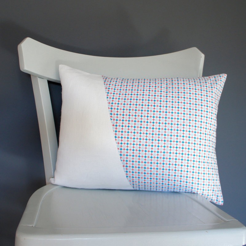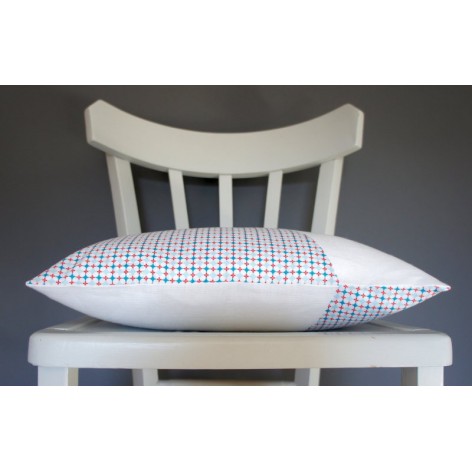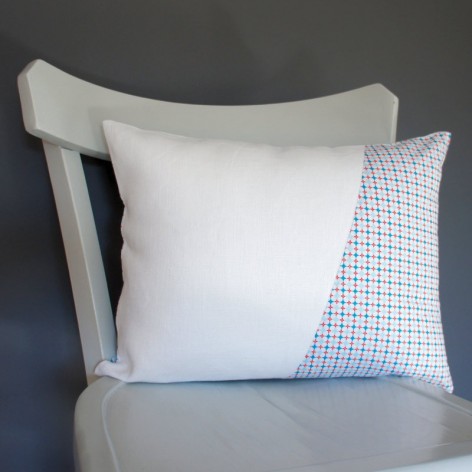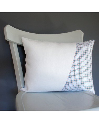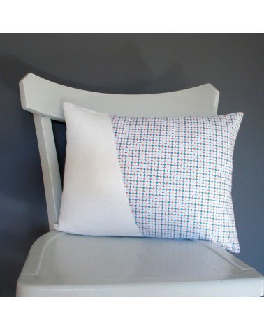 Coussin en lin blanc et coton à motifs géométriques.