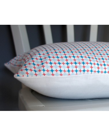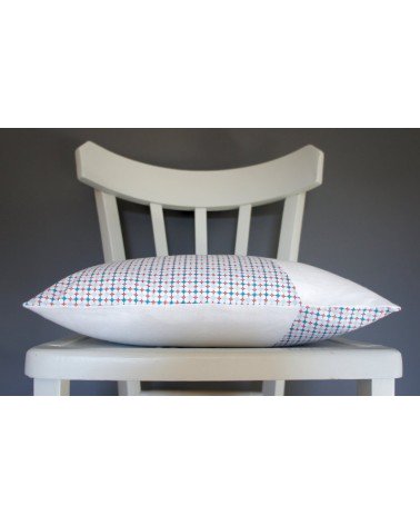 Coussin graphique en lin blanc et coton à petits motifs bleus