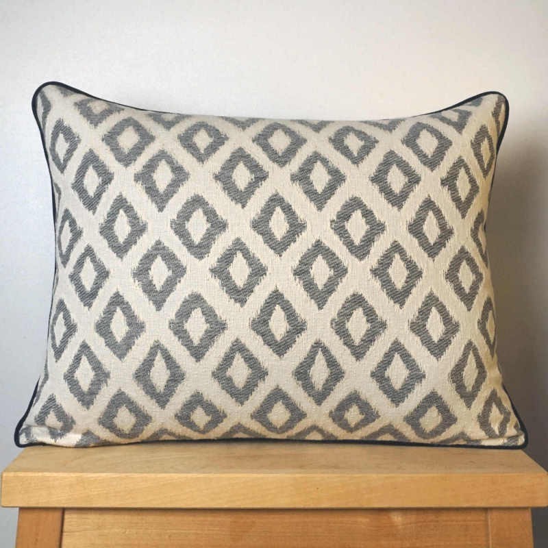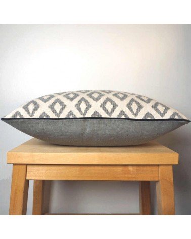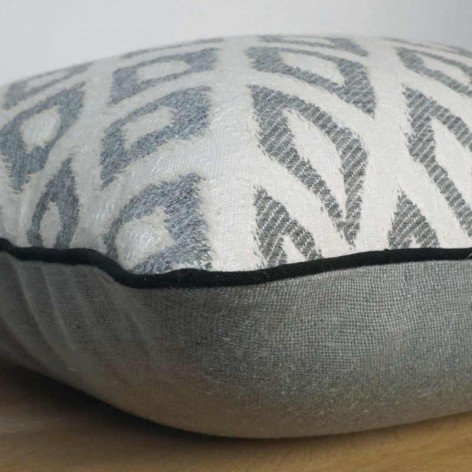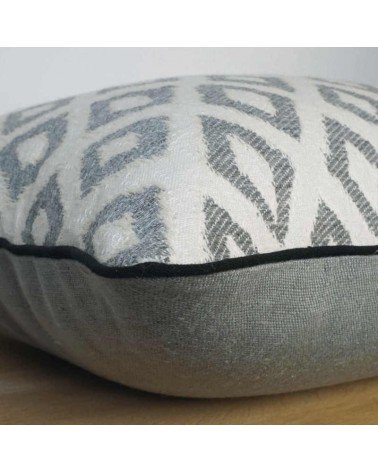 Coussin aux motifs géométriques réalisé en tissu jacquard dans les tons gris sur fond écru pour la face avant.