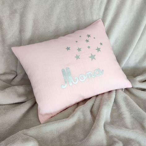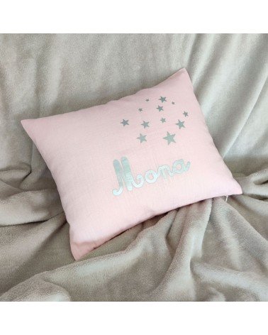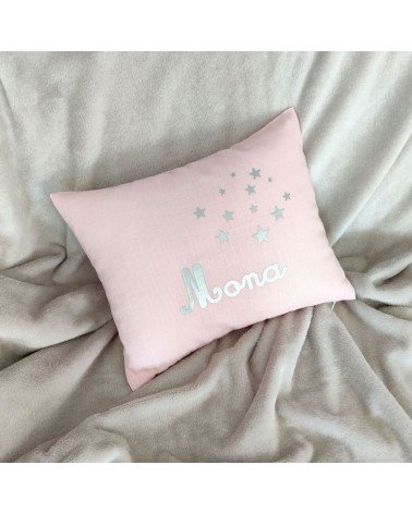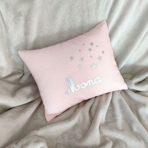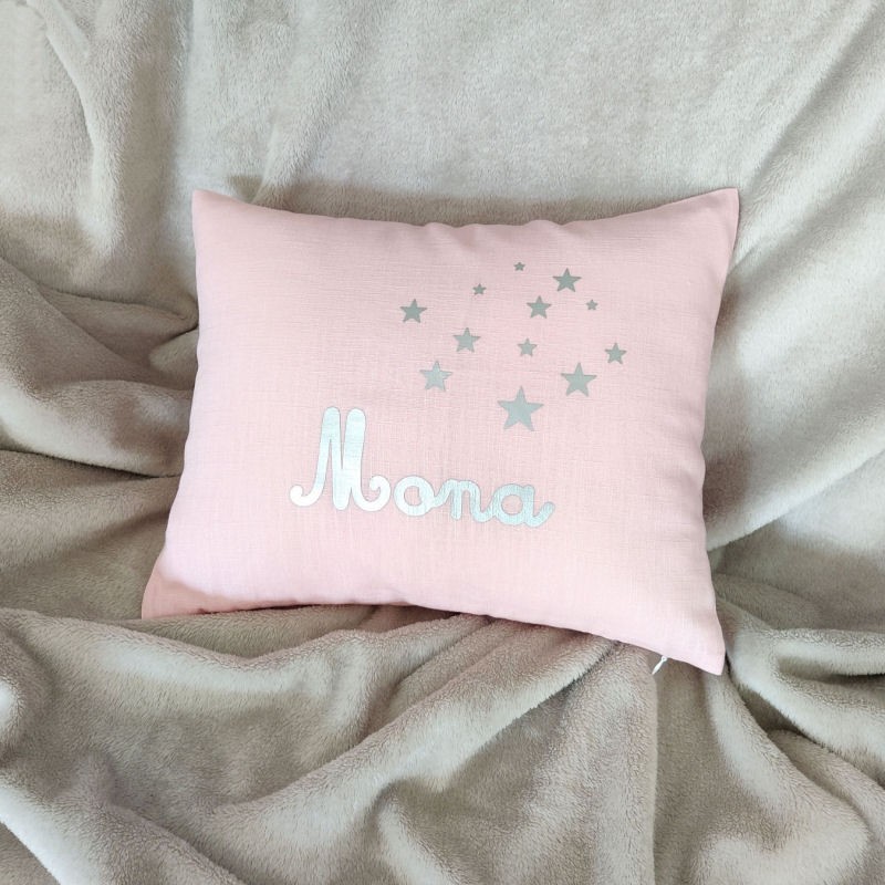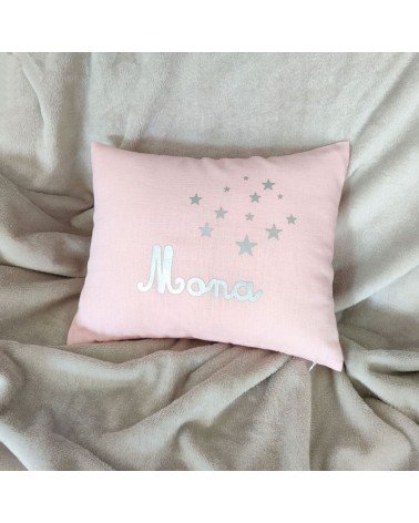 Coussin en lin rose pâle personnalisable avec un prénom, inscriptions argentées