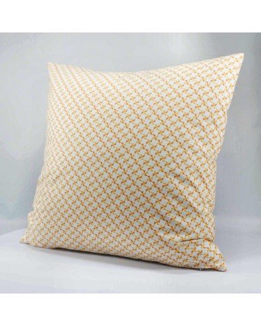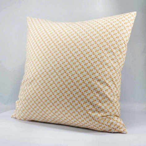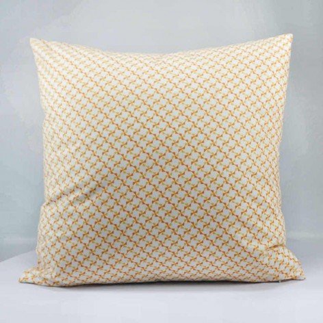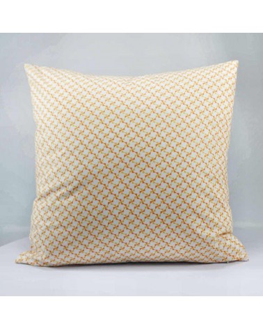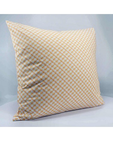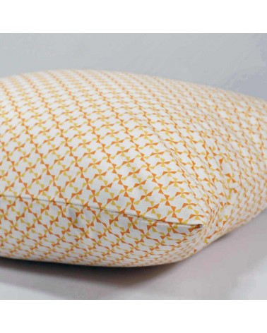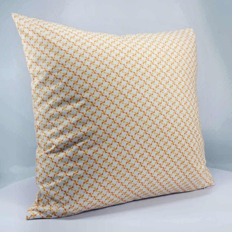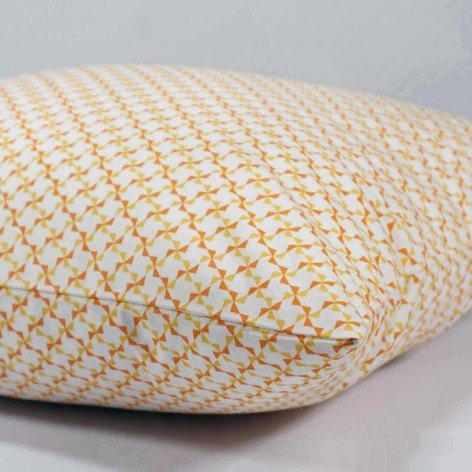 Housse de coussin en coton imprimé de motifs géométriques en forme de moulins, de couleur orange et jaune.