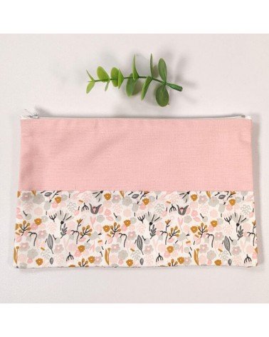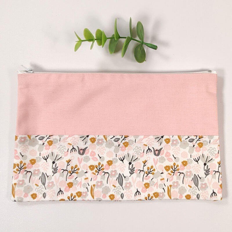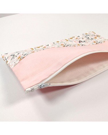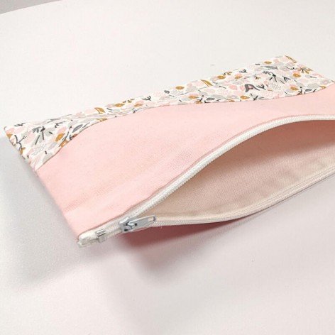 Pochette bicolore en coton fleuri et coton rose, doublée de coton blanc.