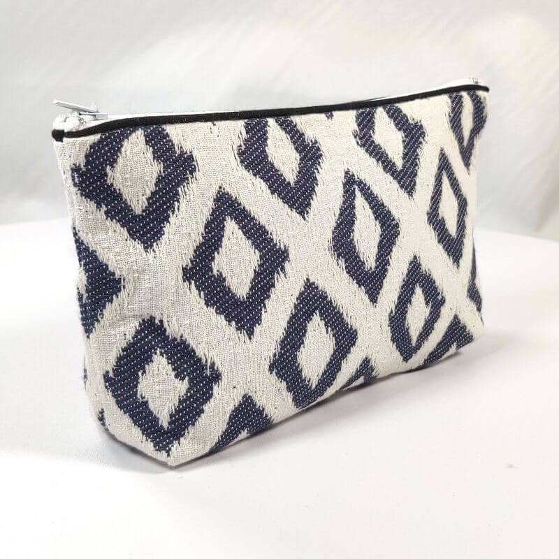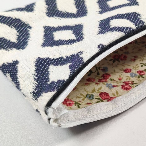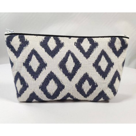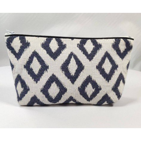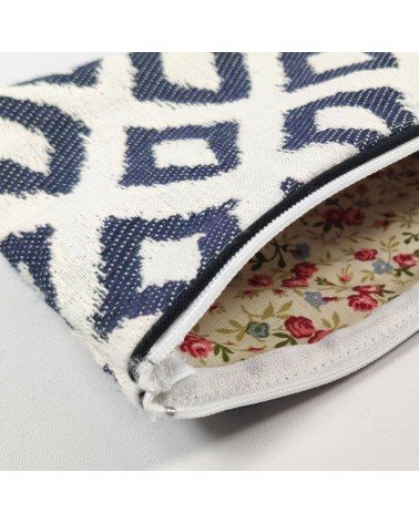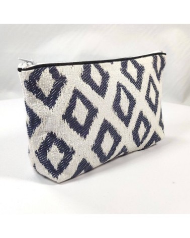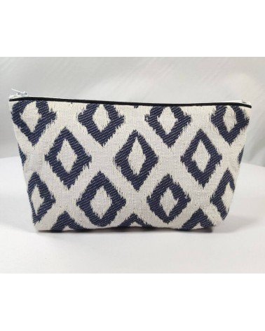Trousse en jacquard à losanges bleu marine, doublée en coton fleuri.