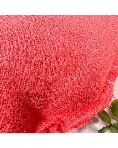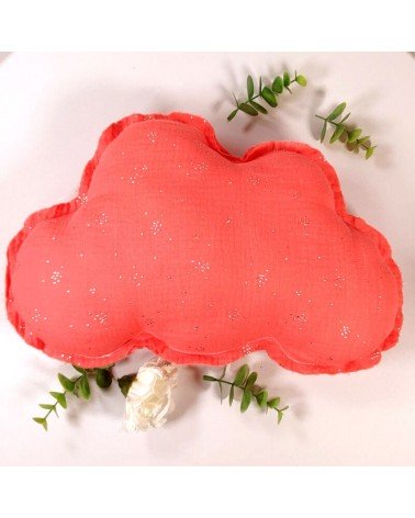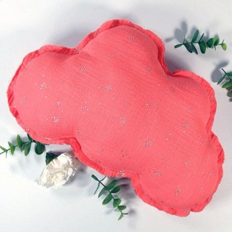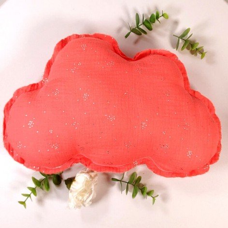 Coussin en forme de nuage en double gaze coloris corail avec les bords bruts.