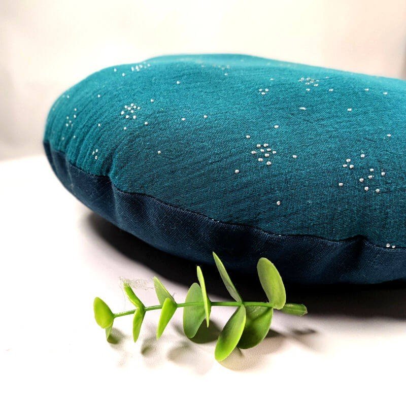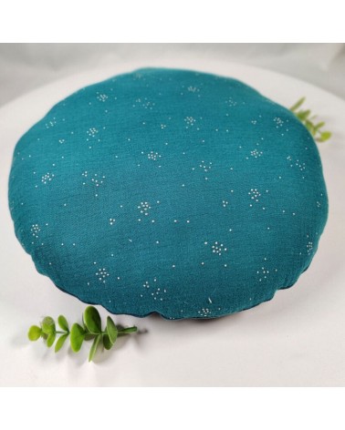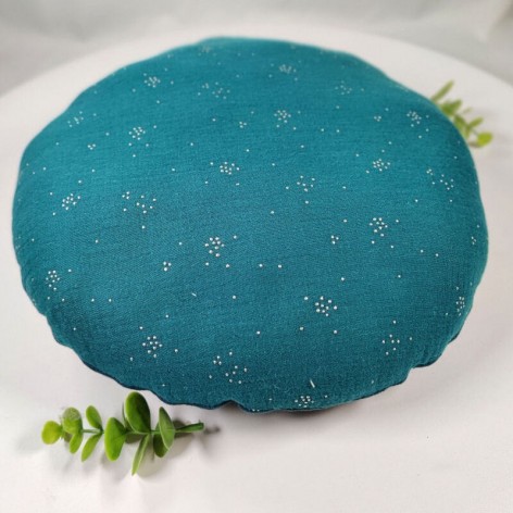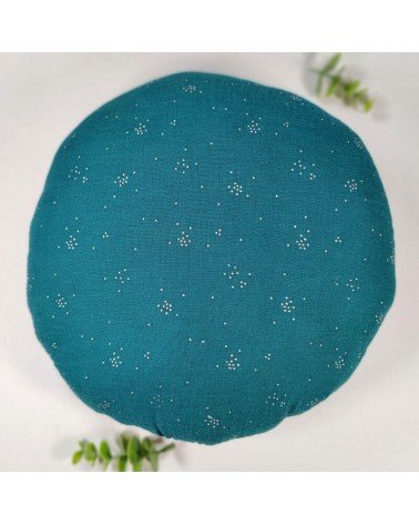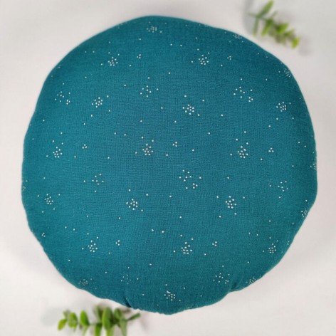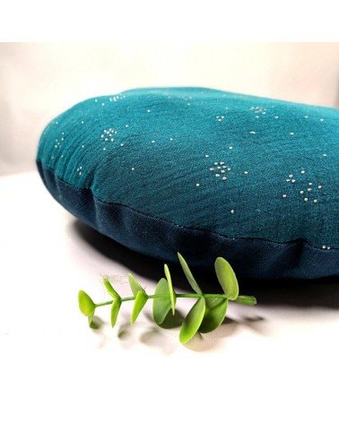 Coussin rond biface en double gaze et lin bleu canard