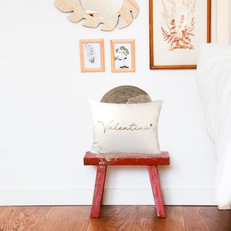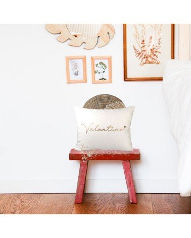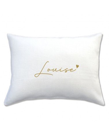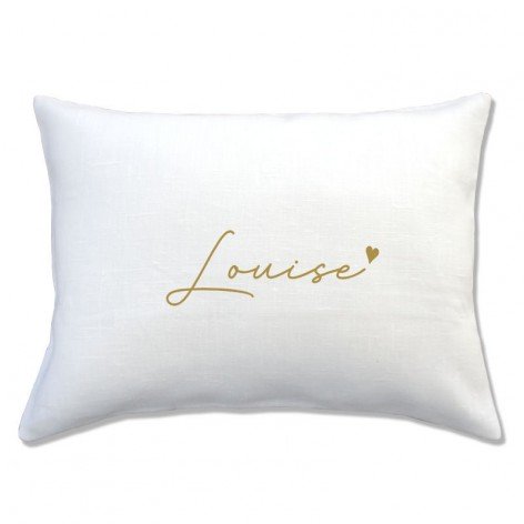 La housse du coussin est réalisée en lin blanc et les inscriptions sont dorées, légèrement irisées.
