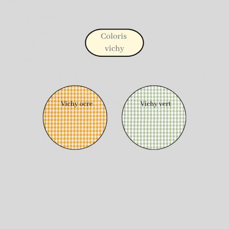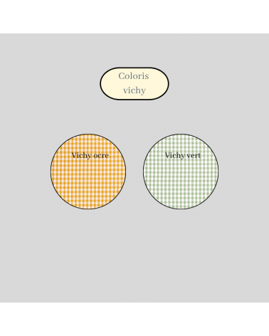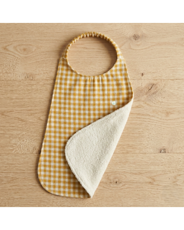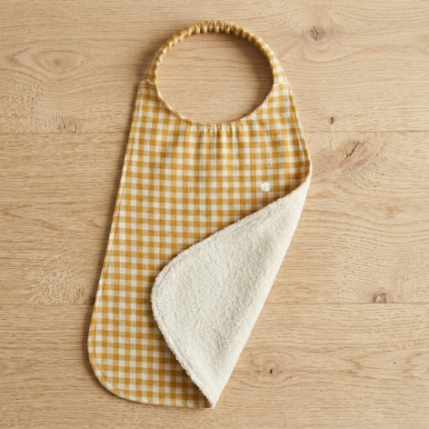 Le devant est réalisé en coton vichy, coloris ocre ou vert menthe, et le dos est en éponge bambou écrue.