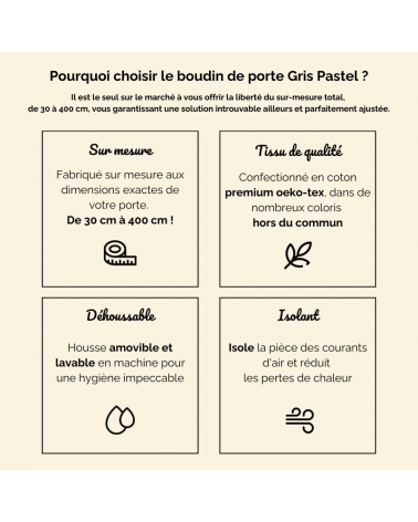 Les boudins de porte Gris Pastel protégeront élégamment votre intérieur des courants d'air et habilleront votre porte d'entrée en apportant une touche d'humour ou de douceur à votre intérieur.