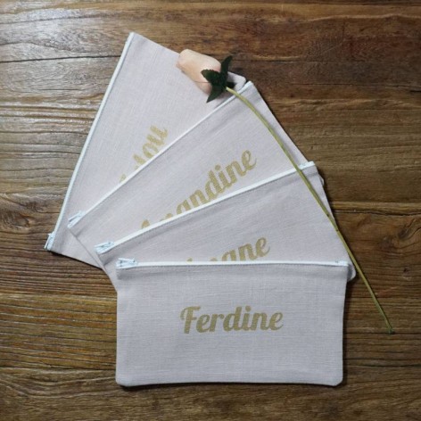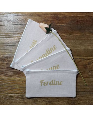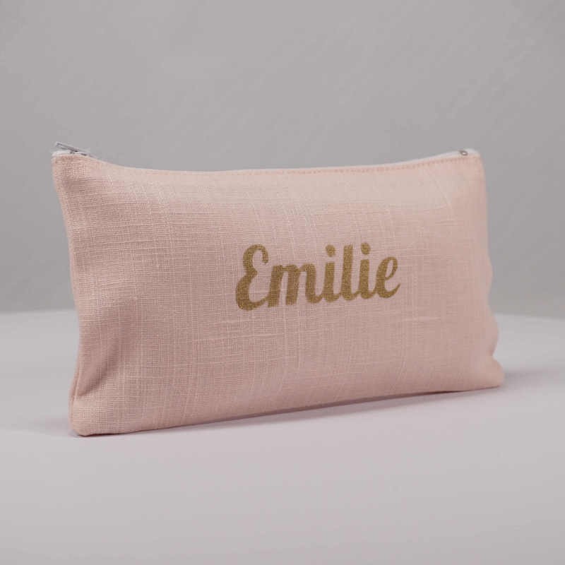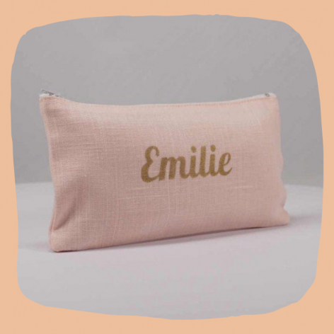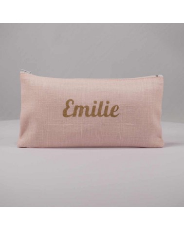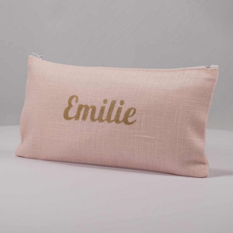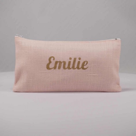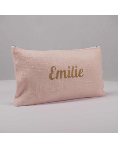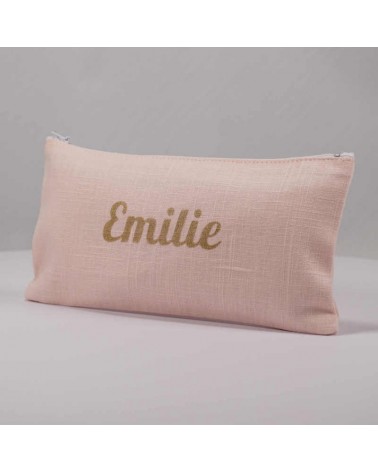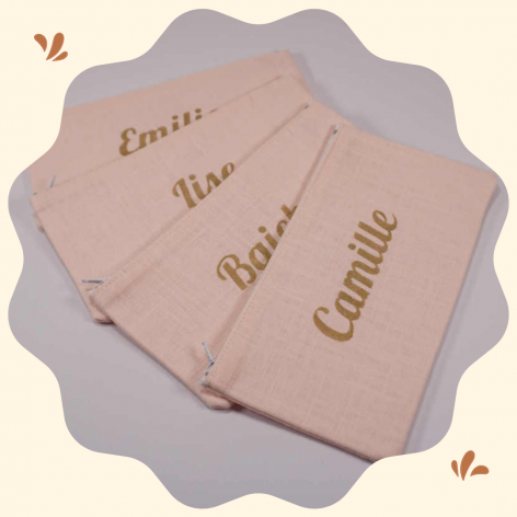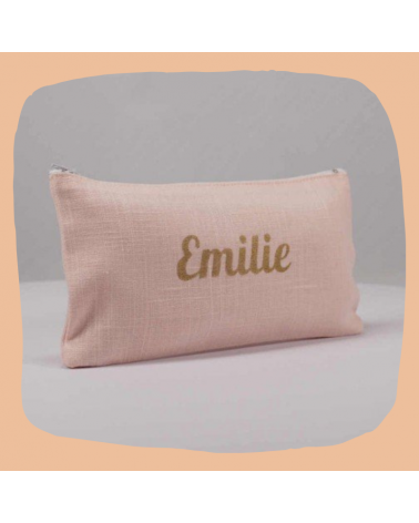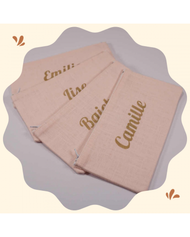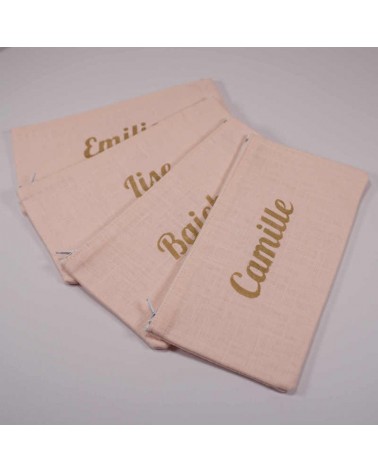 Pochette en lin rose pâle avec prénom floqué en doré.