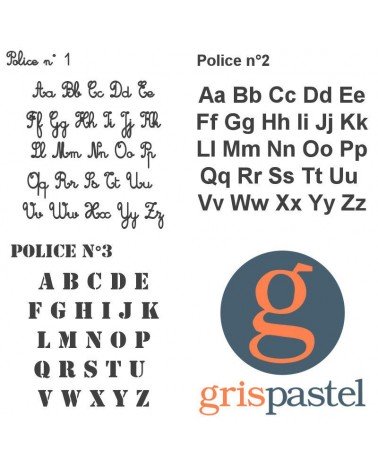 Coloris du lin,couleurs des inscriptions (voir nuancier) et police au choix (voir photo). Les couleurs des inscriptions sont à préciser dans l'onglet "Personnalisation".