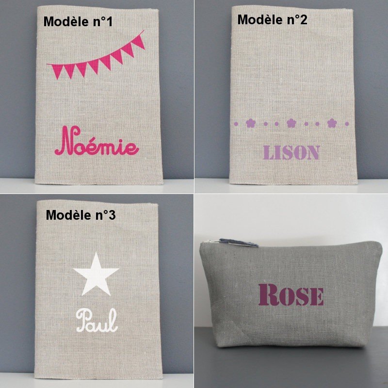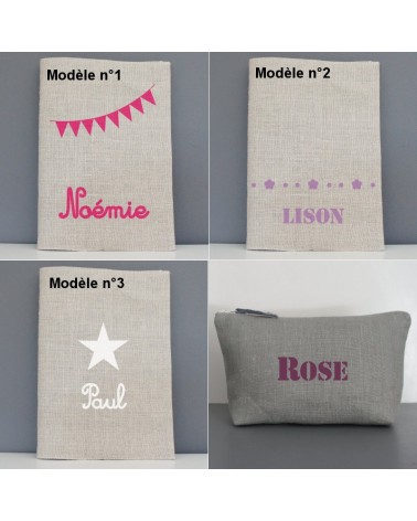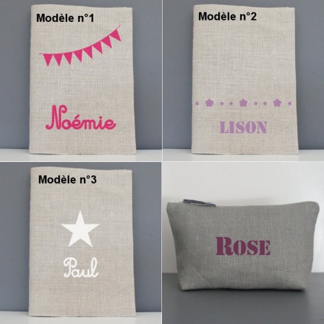 - Un protège carnet de santé personnalisé en lin, modèle, couleurs et police de caractères au choix.