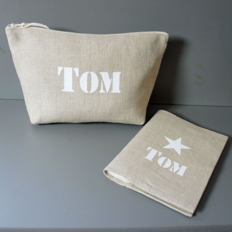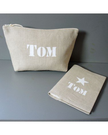 - Une trousse de toilette personnalisée en lin (avec doublure en lin) grand modèle de dimensions30x19x9 cm, couleurs et police de caractères au choix.