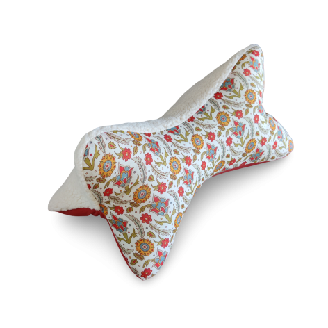 Il a 3 faces en 3 tissus différents : fausse fourrure écrue, coton tomette et coton motif fleurs indiennes.