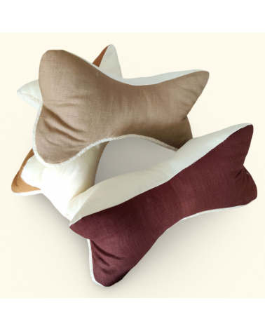 Il a 3 faces en 3 tissus différents : fausse fourrure écrue, double gaze ivoire et double gaze/lin coloris au choix.