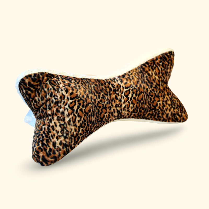 Il a 3 faces en 3 tissus différents : fausse fourrure écrue, lin ivoire et velours léopard.