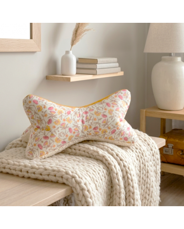 Il a 3 faces en 3 tissus différents : fausse fourrure écrue, lin jaune moutarde et coton motif fleurs indiennes.