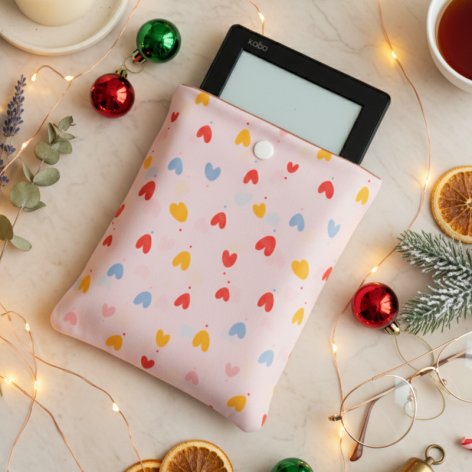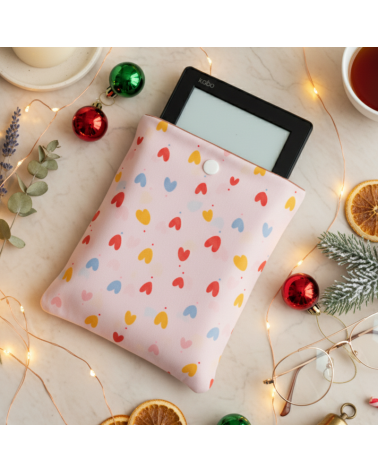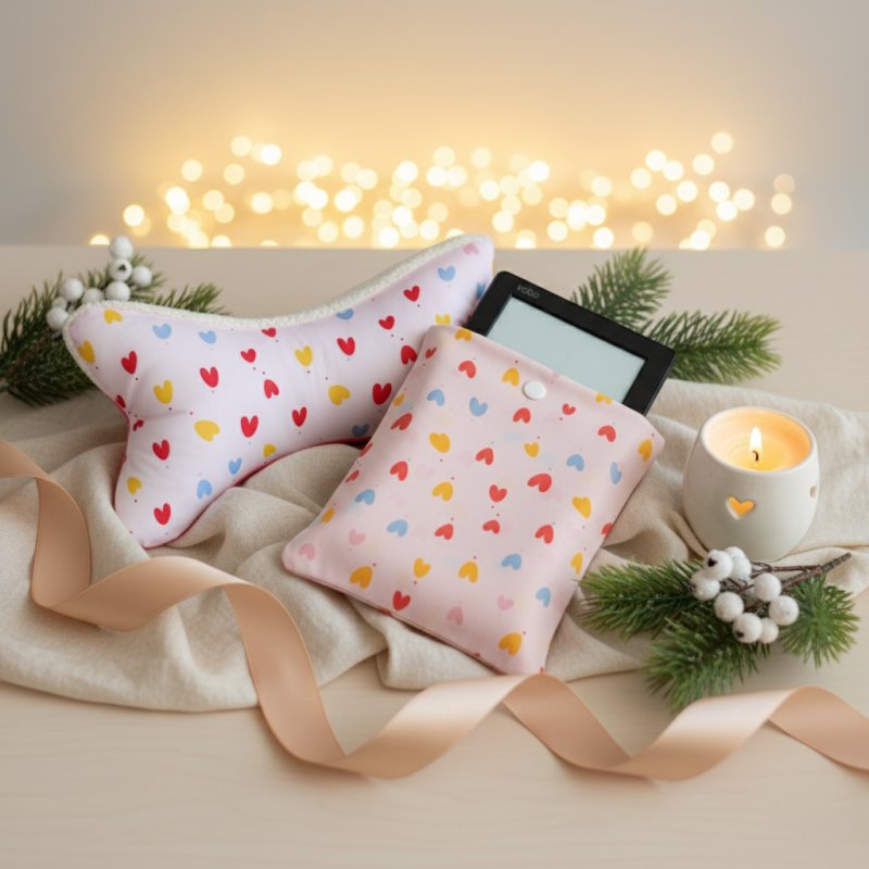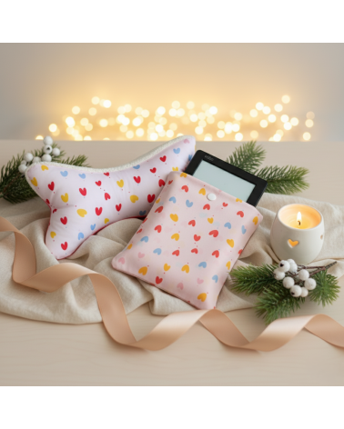 Ensemble cadeau coussin os de lecture et housse liseuse motif coeurs