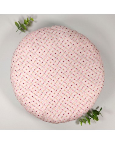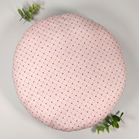 Coussin rond biface en coton imprimé et lin blanc.