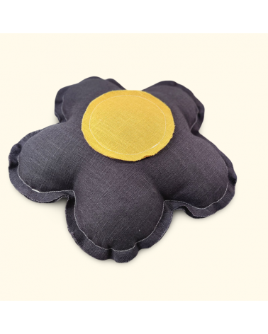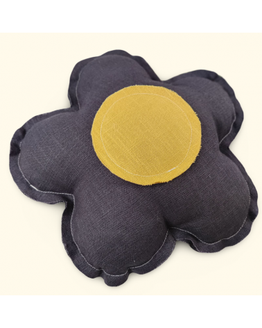 Ce coussin pour enfant en forme de fleur est réalisé en lin bleu, avec le coeur en lin moutarde.