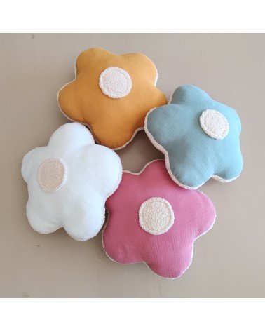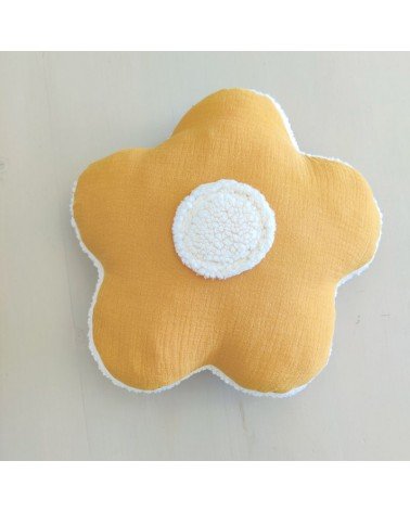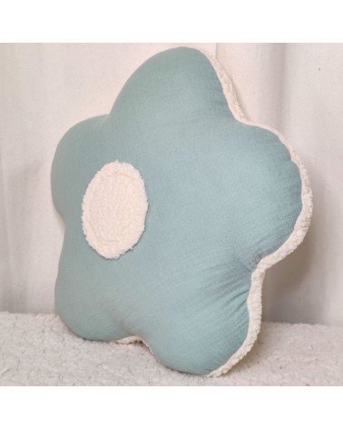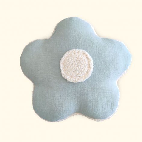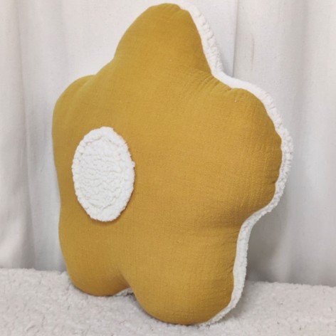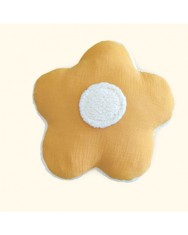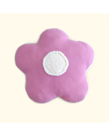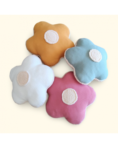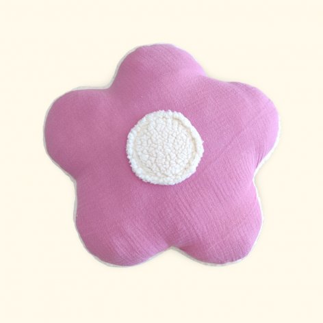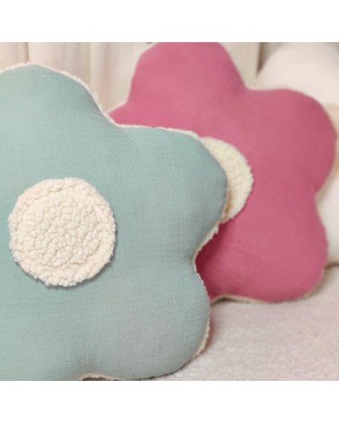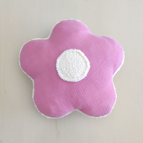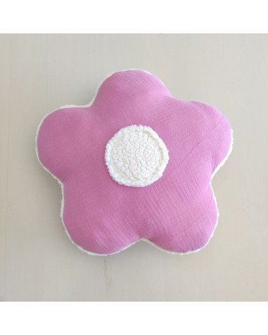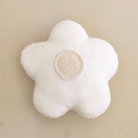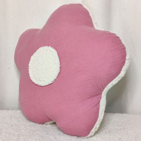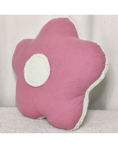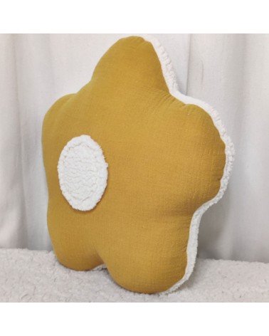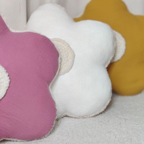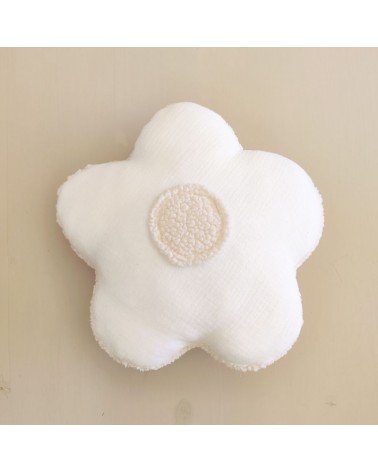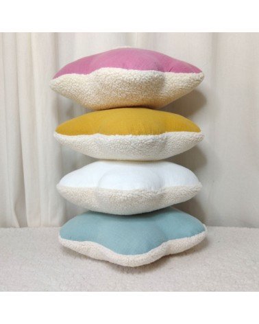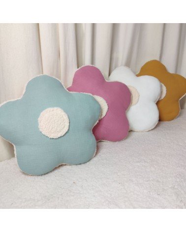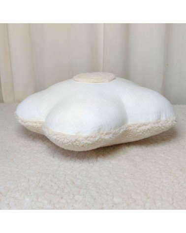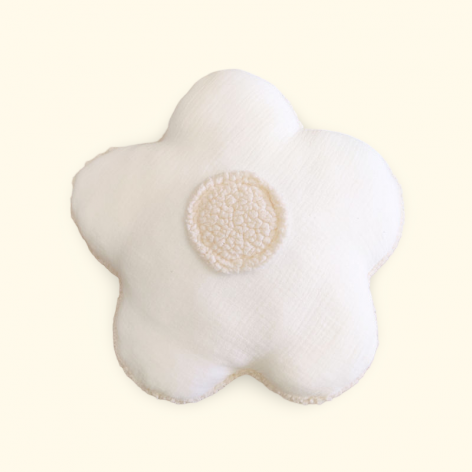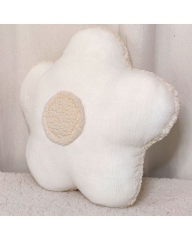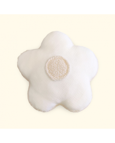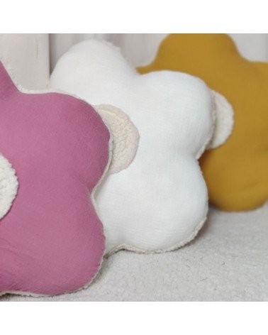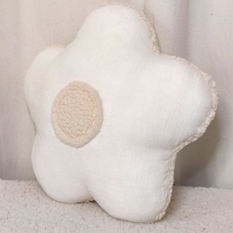 Ce coussin pour enfant en forme de fleur est réalisé en double gaze avec le dos en fausse fourrure sherpa écrue.