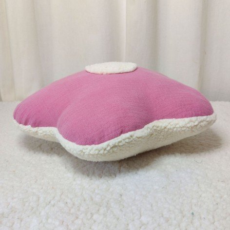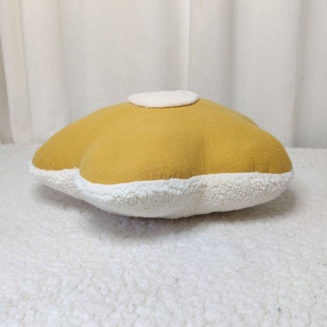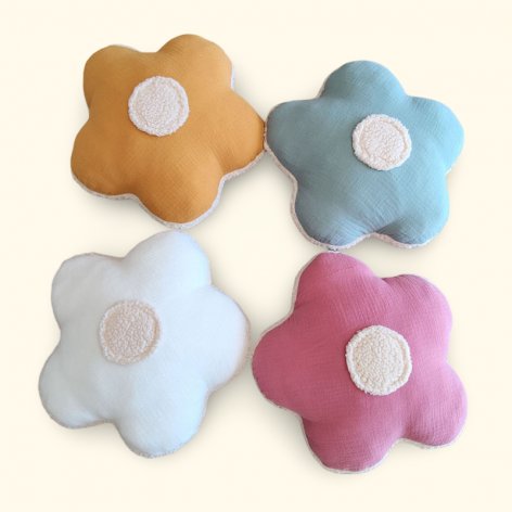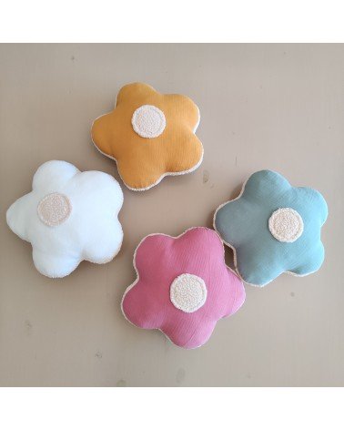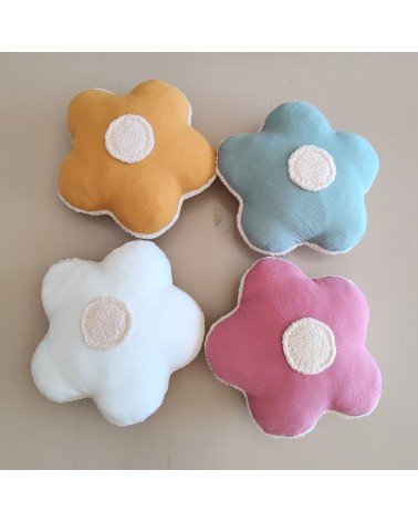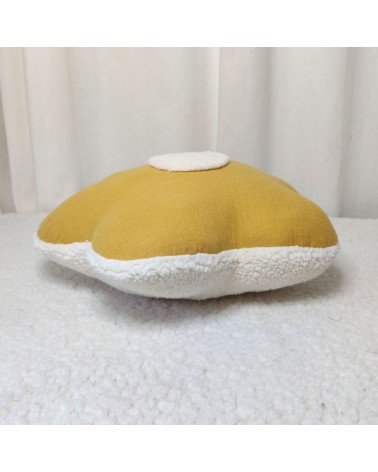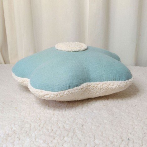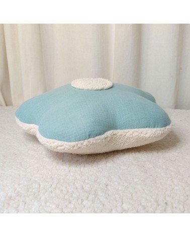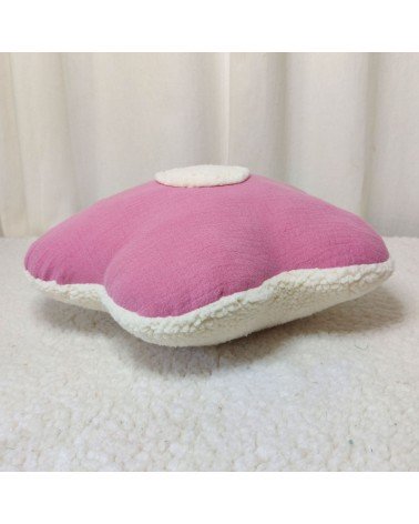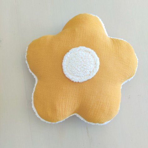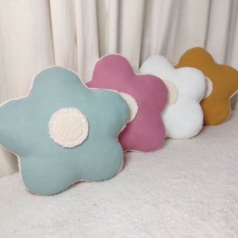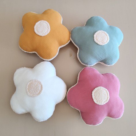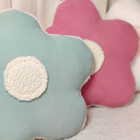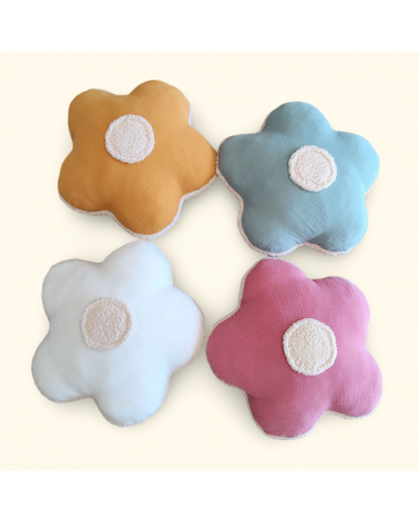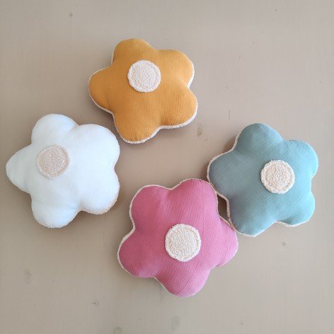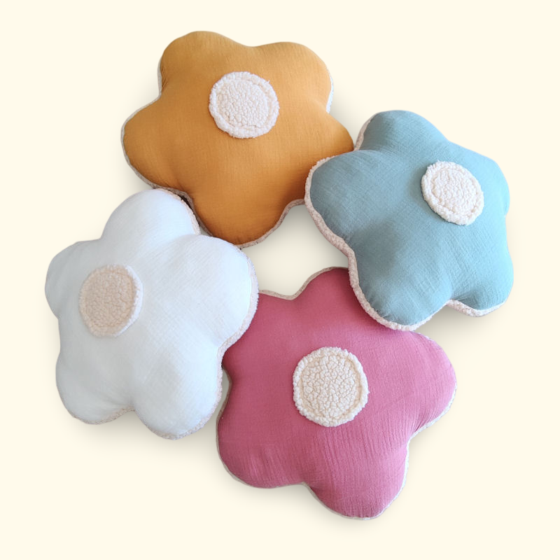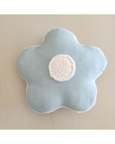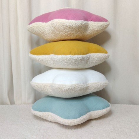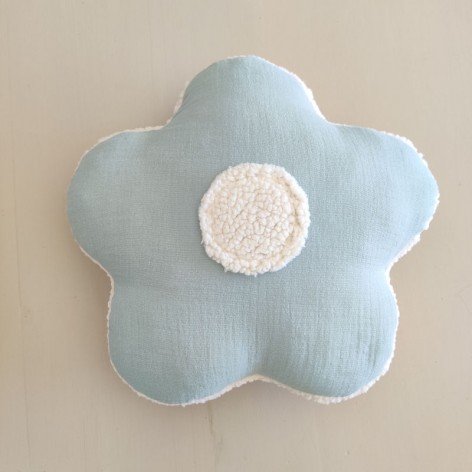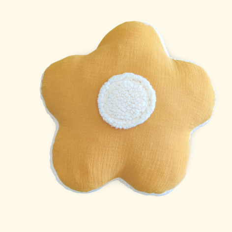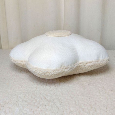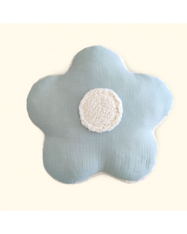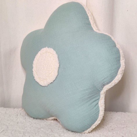 Ce coussin pour enfant en forme de fleur est réalisé en double gaze avec le dos en fausse fourrure sherpa écrue.