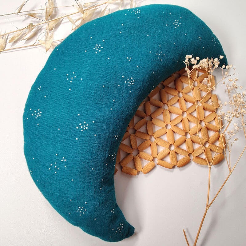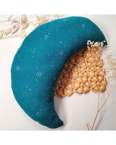 Coussin pour enfant en forme de lune en double gaze de coton à petits pois argentés, coloris bleu pétrole.