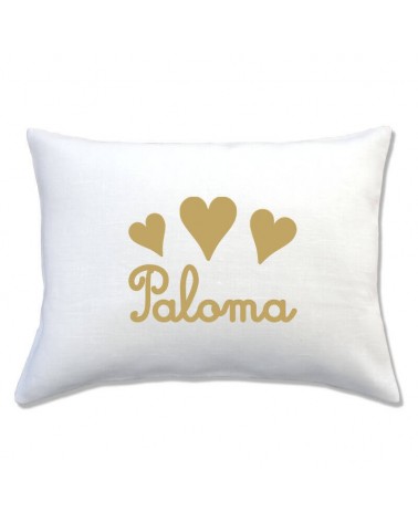 Coussin en lin blanc personnalisé avec un prénom, motif coeurs