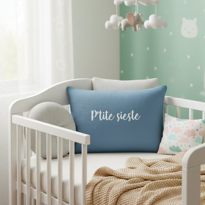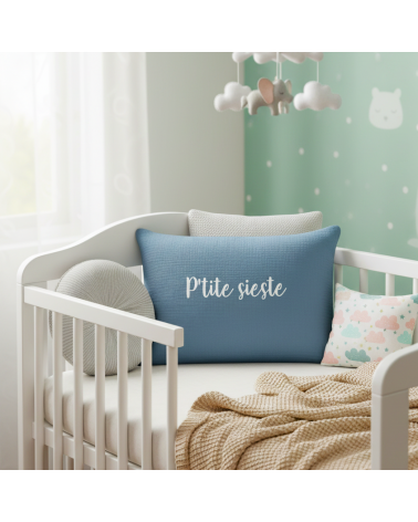 ⭐ Coussin en double gaze de coton avec les inscriptions floquées en blanc.