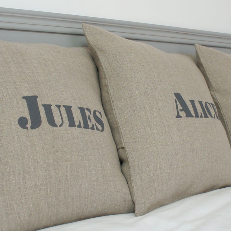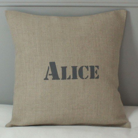Un prénom, un mot ou une ligne de texte est floqué sur cette housse de coussin.