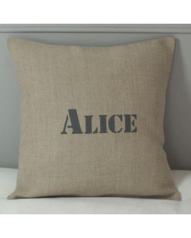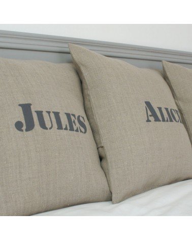 Coussin en lin naturel, personnalisable avec un prénom ou un texte de votre choix coloris noir ou blanc.