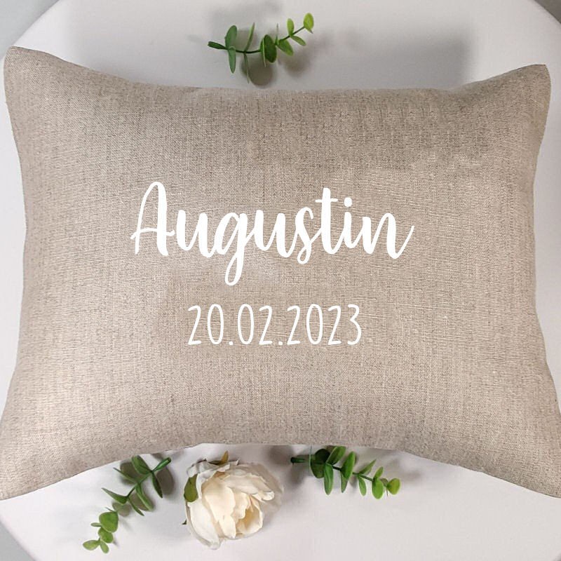 ⭐ Coussin de naissance en lin naturel, avec sa personnalisation au prénom et date de naissance de votre enfant.