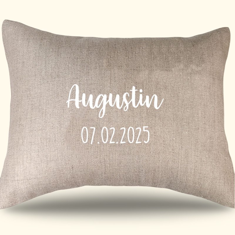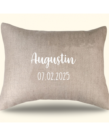 N'oubliez pas d'enregistrer vos choix pour pouvoir ajouter au panier⭐ Coussin de naissance en lin naturel, avec sa personnalisation au prénom et date de naissance de votre enfant.
