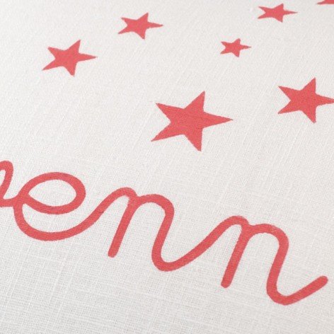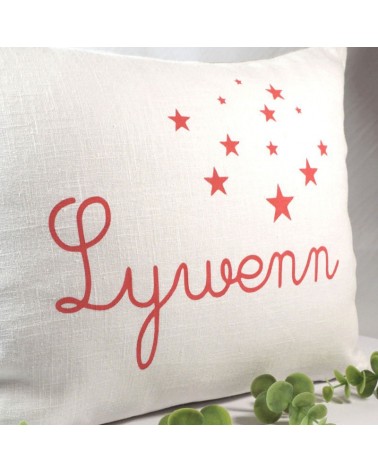 Le coussin en lin personnalisé est réalisé en lin coloris blanc avec le prénom et les étoiles coloris rose fuchsia.