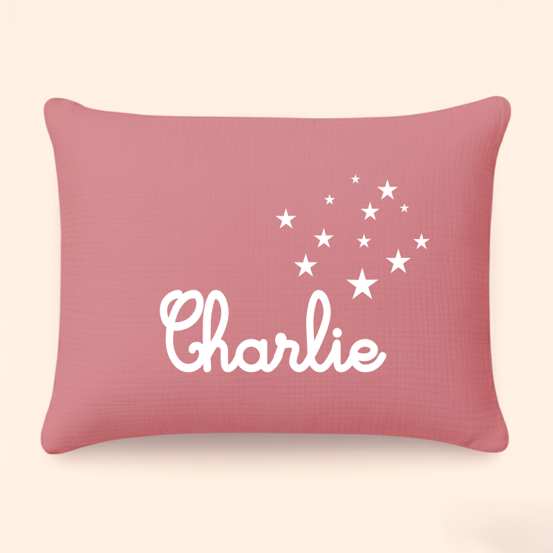 N'oubliez pas d'enregistrer vos choix pour pouvoir ajouter au panier⭐ Coussin en double gaze de coton coloris vieux rose avec les inscriptions floquées en blanc.