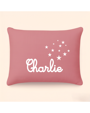Ce coussin personnalisé naissance avec un prénom et un motif étoiles est confectionnée dans un beau tissu de double gaze de coton.