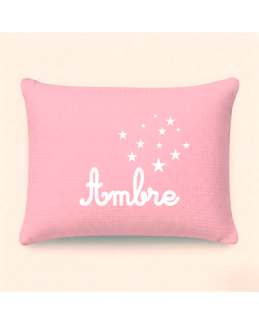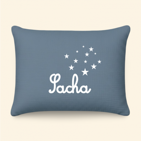 Ce coussin personnalisé naissance avec un prénom et un motif étoiles est confectionnée dans un beau tissu de double gaze de coton.