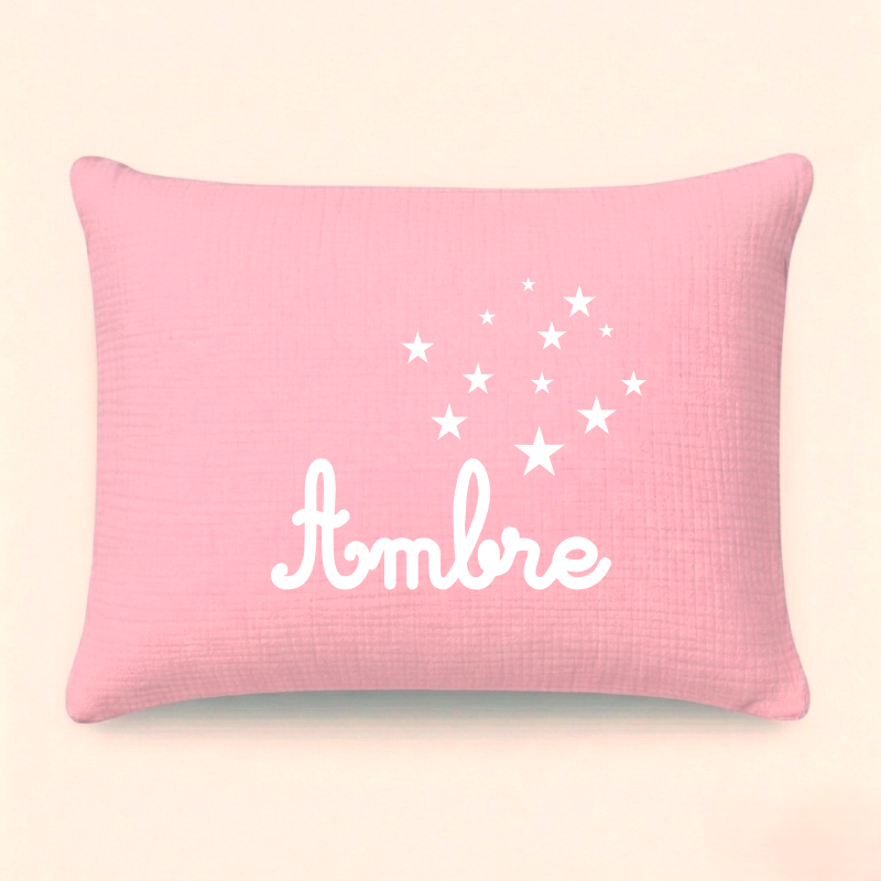 N'oubliez pas d'enregistrer vos choix pour pouvoir ajouter au panier⭐ Coussin en double gaze de coton coloris rose bonbon avec les inscriptions floquées en blanc.