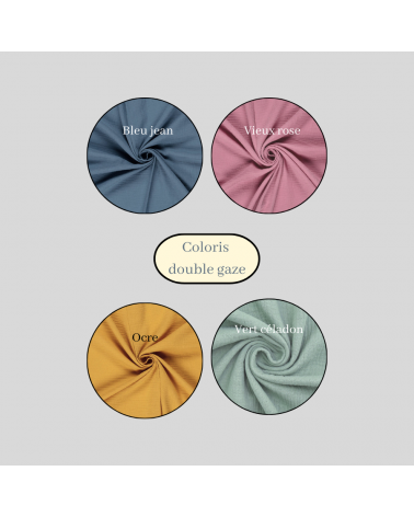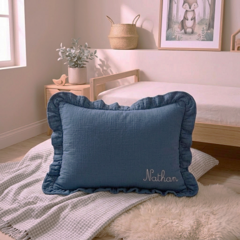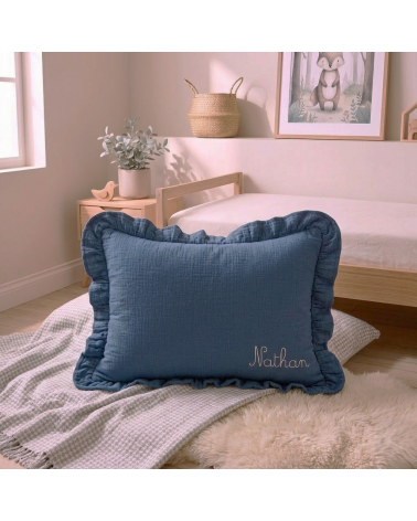 Petit coussin en double gaze de coton, coloris au choix, personnalisable avec un prénom inscrit en bas à droite du coussin.