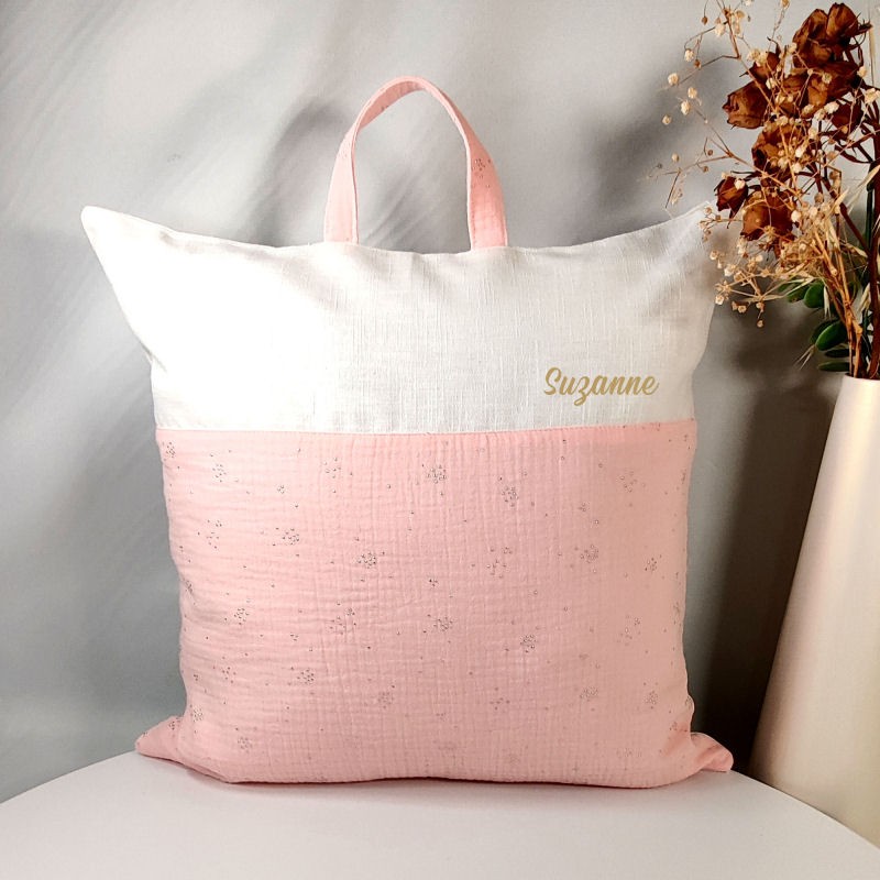 Ce coussin de sieste personnalisable, de 40x40 cm ou 30x40 cm, avec poignée de transport, est conçu...