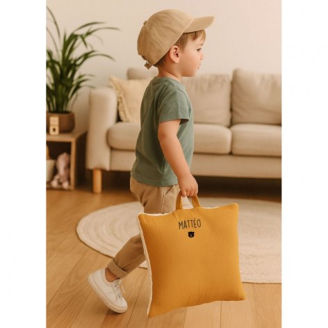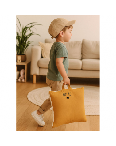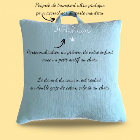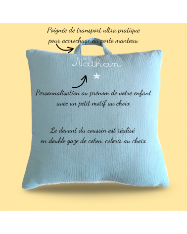 Ce coussin de sieste personnalisable, de 40x40 cm ou 30x40 cm, avec poignée de transport, est conçu spécialement pour les enfants à l'école maternelle. Confectionné à la main avec amour, ce coussin offre un confort optimal et une personnalisation unique. Il est réalisé en double gaze de coton toute douce avec dos en sherpa pour des moments de repos agréables. Le coussin (ou la housse) est lavabe en machine. Coussin d'une poignée pour un transport facile et pour l'accrocher au porte-manteau de l'école. Découvrez aussi le kit de sieste comprenant le coussin et une couverture assortie pour offrir à votre enfant des moments de repos harmonieux et confortables.