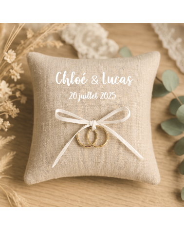 Nous créons pour vous un modèle unique et original, en lin naturel beige, avec les prénoms de mariés et la date du mariage floqués en blanc.