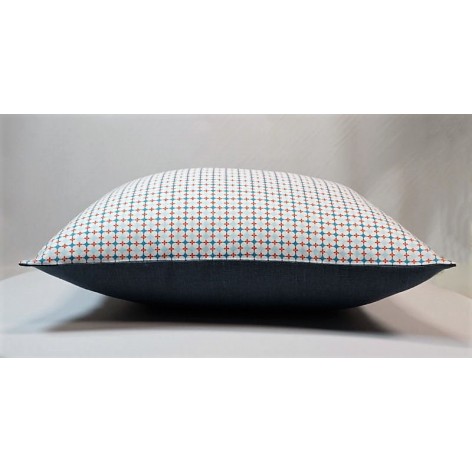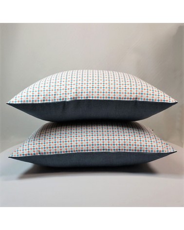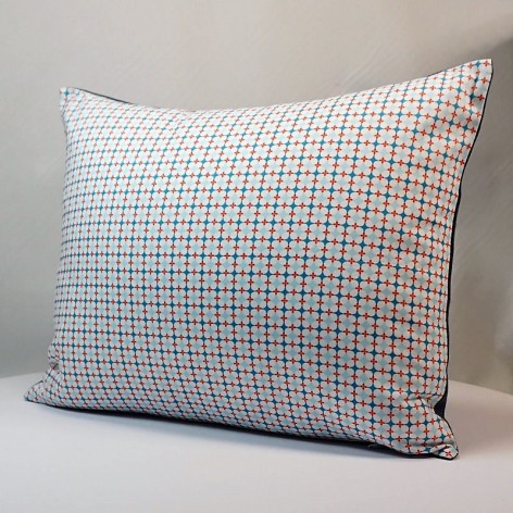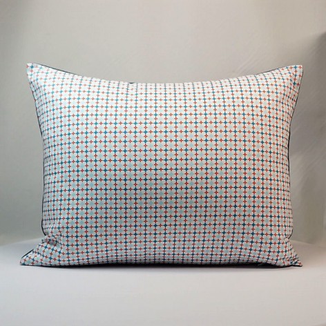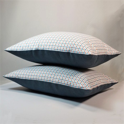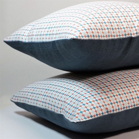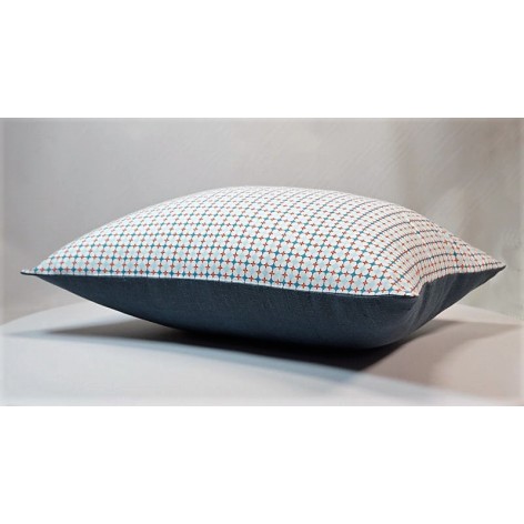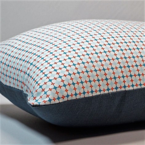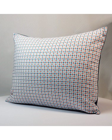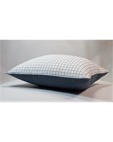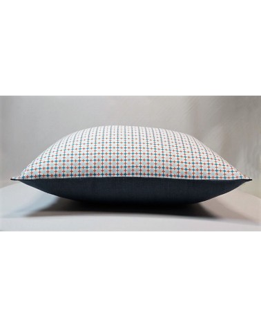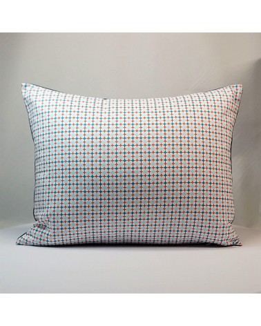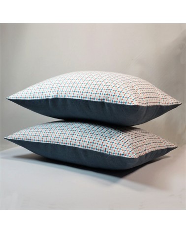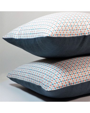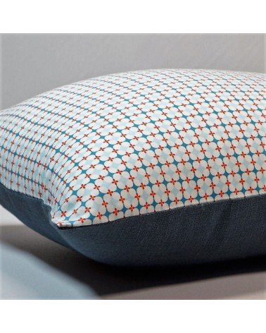Housse de coussin en coton à motifs géométriques, coloris bleu, blanc et rouge.