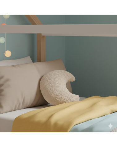 Ce coussin en forme de lune est réalisé en fausse fourrure sherpa écrue, douceur assurée dans une chambre de bébé ou d'enfant.