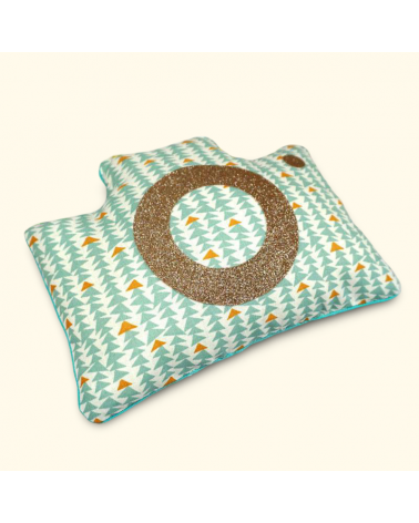 Coussin pour enfant en forme d'appareil photo en coton à motifs triangles dans les tons vert.