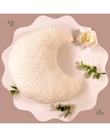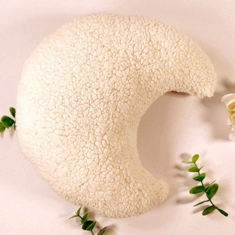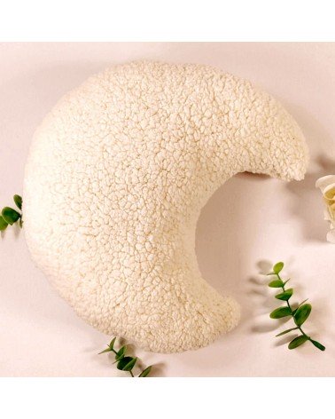 Ce coussin en forme de lune est réalisé en fausse fourrure sherpa écrue, douceur assurée dans une chambre de bébé ou d'enfant.