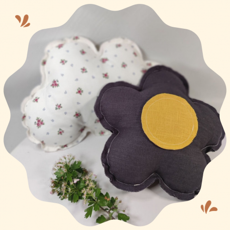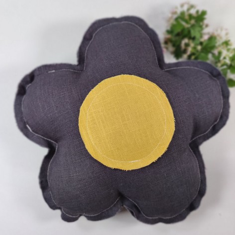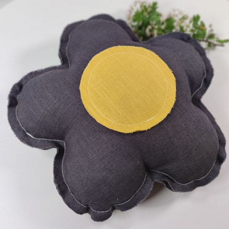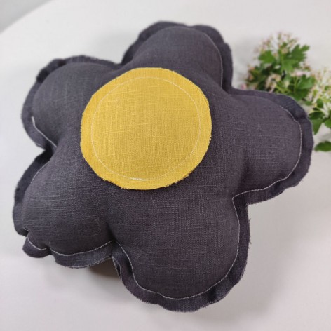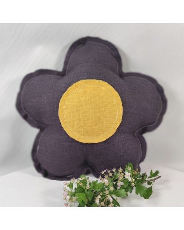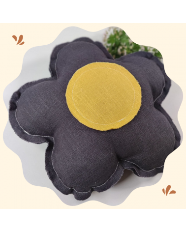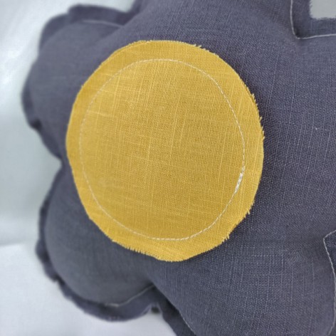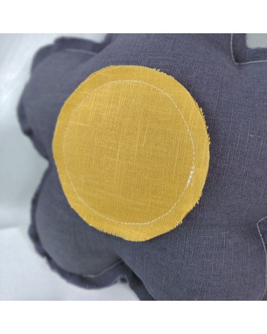 Ce coussin pour enfant en forme de fleur est réalisé en lin bleu, avec le coeur en lin moutarde.