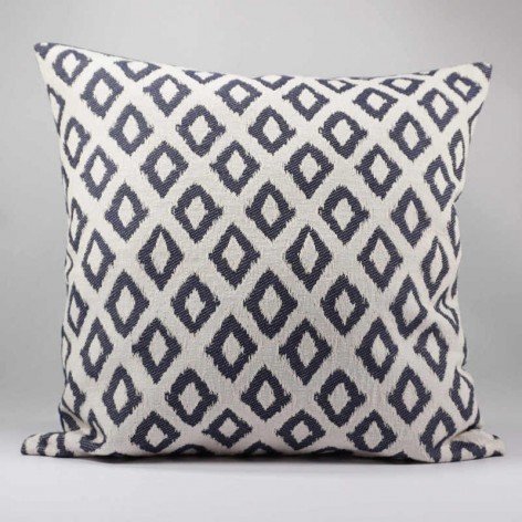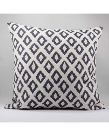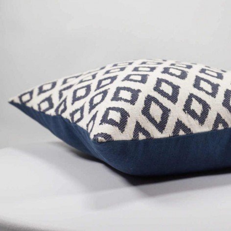 Housse de coussin réalisé en tissu jacquard dans les tons bleu sur fond écru pour la face avant.