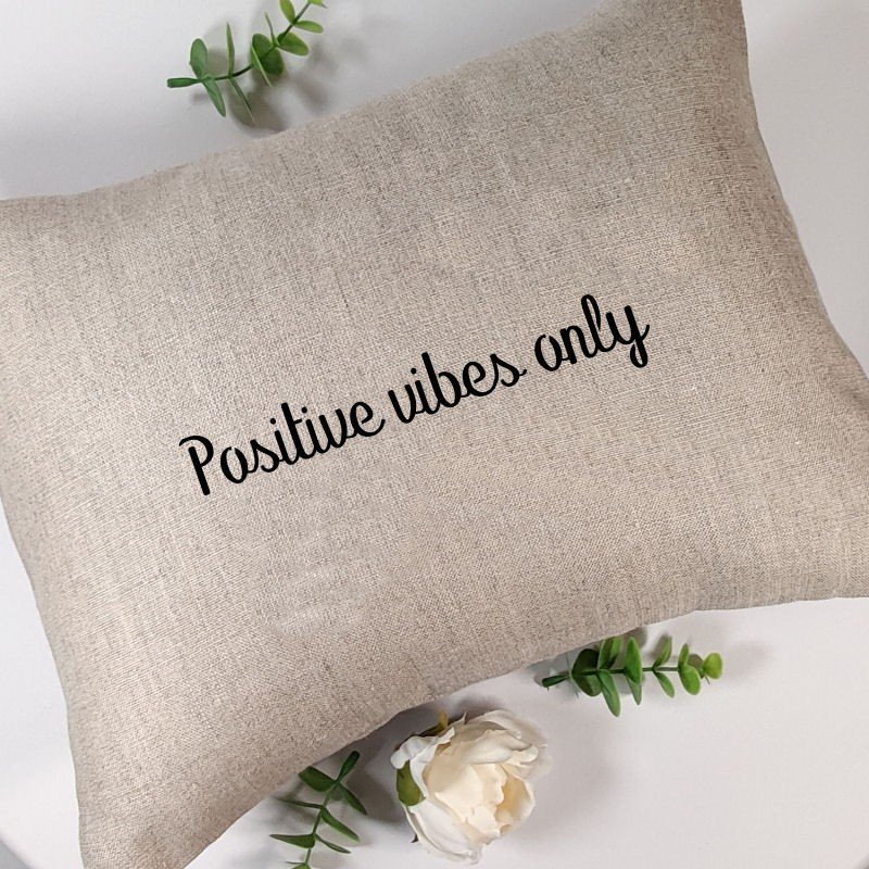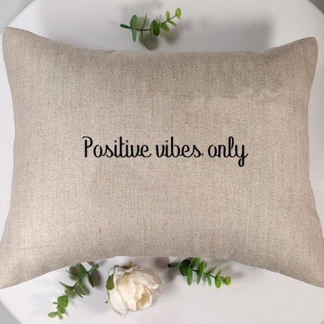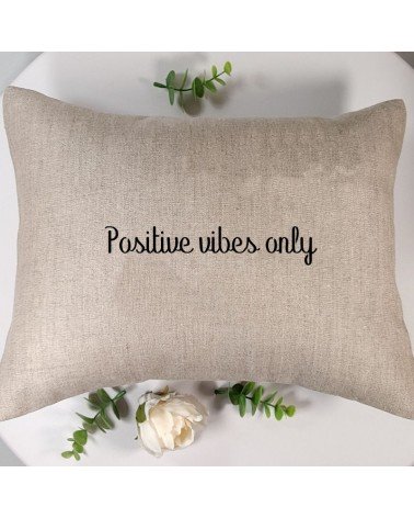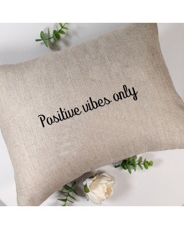 Housse de coussin en lin naturel avec la citation "Positive vibes only" en flocage noir.